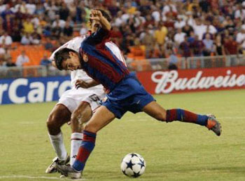 中新網(wǎng)7月31日電 在北京時間今天上午進行的一場國際友誼賽中,來自西班牙的巴塞羅那隊憑借著新加盟的球員夸雷斯馬和羅納爾迪尼奧的進球,以2-0擊敗了歐洲冠軍AC米蘭隊。