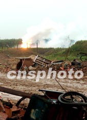記者趕到成功引爆以后的現場,發現引爆現場還在冒著濃濃的白煙,據郭新年介紹,這是因為還有剩余的硫沒有燃燒完。他還介紹說,為了保證打火的成功,他們用了三根引線同時點火。電打火引爆炸藥點燃了原先鋪設的煤油和油布,引起可燃爆物的燃燒爆炸。前面聽到了兩聲大的響聲是引爆炸藥的聲音,后三聲爆炸聲來自那些可燃爆物的燃燒爆炸。