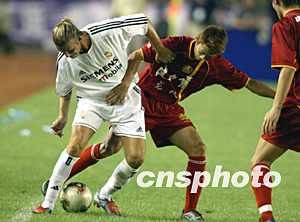 西班牙皇家馬德里足球隊與中國健力寶龍隊的比賽八月二日晚在北京工人體育場舉行。圖為龍隊隊員對貝克漢姆嚴加防守。中新社記者:毛建軍