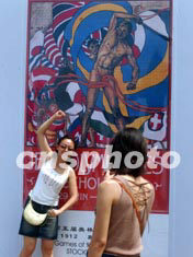 記者昨天在天壇公園看到,會徽發布儀式現場基本準備就緒。場地工作人員正有序地做著布置收尾工作。2008把藍色椅子整整齊齊地擺放在祈年殿前廣場,靜候著北京2008年奧運會會徽光彩亮相。而在會徽發布儀式現場合影留念,昨天成了世界各地游人的共同心愿,在相機鏡頭鎖定的一個又一個燦爛笑容下,北京2008年奧運會會徽將在人們的熱切期待中撩開神秘面紗,閃亮登場。