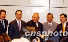八月四日,香港行政長官董建華宣布政府高官任命,唐英年為財政司長(左二);李少光為保安局長(右二);曾俊華為工商及科技局長(左);黃鴻超出任廉政專員(右)。中新社記者:潘索菲