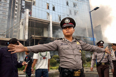 爆炸發生后,濃煙烈火從酒店的地下層冒出來。爆炸已經摧毀了一個酒店里的一家餐廳,酒店的大堂也部分受損。酒店的大堂以及門口停放的8輛汽車在燃燒。酒店及附近一幢高樓的多個樓層窗戶的玻璃被震碎。印尼《羅盤報》的一名記者說:“我看見幾輛出租車在燃燒,我相信是汽車炸彈引起了爆炸。八名受傷的人中有外國人。”