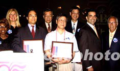 華裔小商業八月五日成為紐約納斯達克交易所的明星,四名華裔商家在這里受到美國聯邦中小企業管理局的表彰。圖為美國聯邦中小企業管理局局長赫克托·巴雷特(右二)向獲獎者頒獎。作者:趙海燕