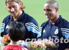 八月六日晚,香港舉行歡迎西班牙皇家馬德里足球隊(duì)抵港記者會(huì),圖為小朋友向“皇馬 ”球星獻(xiàn)花。中新社記者:錢興強(qiáng)
