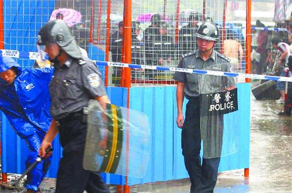 據武副場長介紹,8月5日下午3時15分左右,黃沙市場有關人員得知此事后,派出保安將紅線界上的店鋪移走。昨天上午8時左右,市水產供銷公司一方60多名身穿迷彩服的男子手持木棍、鋼管等物來到黃沙市場內。市場內的保安得知后就迅速向上級報告,并及時向荔灣區多寶路派出所報警。當派出所警察趕至現場時,勸說對方放下木棒及鋼管時,遭到對方拒絕。警察又迅速向110求援,隨后就有10多名防暴警察趕至現場,用盾牌將雙方人員隔開。