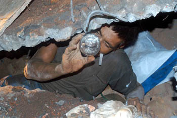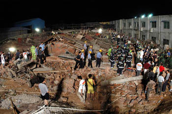 市公安局指揮中心的應急救助車的探照燈把廠房坍塌的事故現場照得一片通明。搶救工作正在緊張地進行。