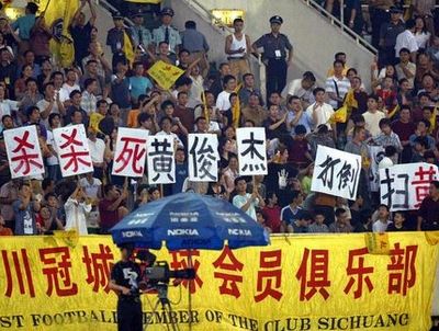 昨日京川之戰的上座率并不高,但球迷的怒氣卻能創下成體之最。比賽第4分鐘,鄒侑根被對方防守隊員拉倒,裁判未判點球,“黑哨”的聲音頓時響起。第43分鐘,現代隊安德烈將比分改寫為1∶0,部分球迷認為這個進球有越位嫌疑。上半場結束后,黃俊杰到冠城會員區附近撿球,馬上引起看臺上一片騷動,小旗桿、廢紙團冰雹般往黃俊杰身上扔。在回休息室的路上,黃俊杰再次遭到“襲擊”,裝滿水的礦泉水瓶“砰”的砸在球員通道上,記者還能看到里面的人影應聲躲閃。下半場開始后,新的標語牌在球迷區舉起,“殺殺殺死黃俊杰”,顯得觸目驚心,部分球迷甚至喊起了帶有人身攻擊的不文明口號。汪嵩的進球被判為越位后,助理裁判朱宏慶也成了被攻擊對象,2區的球迷齊齊豎起中指,一邊高喊:“邊裁,小心得‘非典’!”