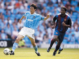 這是曼城備戰新賽季英超的最后一場比賽,同時也是曼徹斯特大球場的揭幕戰,因此,主教練基岡格外重視。孫繼海首發出場擔任右后衛,他的身后是門將西曼。而他面對的是剛剛轉會巴塞羅那隊的小羅納爾多的進攻。第5分鐘,奧維馬斯帶球突破菲利普斯后獲得很好的機會,孫繼海上前封堵,逼得奧維馬斯傳球出界。雖然對手實力很強,但在主場作戰的曼城仍與對手展開對攻。孫繼海與菲利普斯這邊的進攻明顯要比左路活躍。第34分鐘曼城首先打破僵局,貝爾科維奇中路得球后轉身快速突破,雷茨格爾慌亂中將球誤傳給阿內爾卡,法國人門前右腳推射破門。上半場曼城一球領先巴塞羅那。