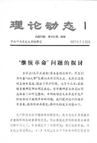 “理論上的撥亂反正,開始于無產(chǎn)階級(jí)專政下繼續(xù)革命這一口號(hào)。一九七七年七月吳江寫了一篇短文《“繼續(xù)革命”問題的探討》,提出社會(huì)主義改造基本完成后,繼續(xù)革命的主要內(nèi)容應(yīng)是文化、技術(shù)革命,生產(chǎn)力的革命。七七年七月那時(shí)候提出這個(gè)論點(diǎn)是不容易的,可以說是理論上撥亂反正的第一個(gè)行動(dòng)。我把這篇文章送小平同志看了,小平同志表示完全同意。這是我和小平同志在理論問題上第一次接觸,那時(shí)喬木同志還沒有恢復(fù)工作。這篇短文當(dāng)時(shí)就作為《理論動(dòng)態(tài)》創(chuàng)刊第一期發(fā)表。三中全會(huì)后過了一個(gè)時(shí)候,中央提出廢止無產(chǎn)階級(jí)專政下繼續(xù)革命的口號(hào),也是對(duì)的,那是以后的事了。”(《十年的路》第22頁)胡耀邦認(rèn)為,理論上的撥亂反正是從否定“繼續(xù)革命”口號(hào)開始,《理論動(dòng)態(tài)》發(fā)表《“繼續(xù)革命”問題的探討》這篇文章是“第一個(gè)行動(dòng)”,而且,這篇文章是他同鄧小平在理論問題上的“第一次接觸”。由此可見這篇文章的重要性。