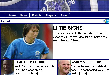 李鐵今天下午在英國簽約后,埃弗頓俱樂部就在第一時間里迫不及待的在其官方網站上向球迷通報了這一喜訊。報道稱,李鐵終于與埃弗頓簽約,并將為球隊效力到2006年。