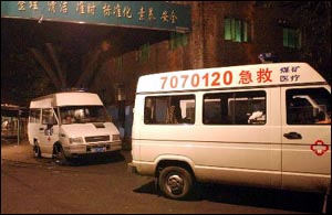現場到處是救護車、警車、醫生、救護隊員。由于是國有大礦,一切救護工作都顯得井然有序。井口在一個不大的四方小院里,井口邊緣掛著燈,再往里看時,感覺到黑壓壓的很深。井口正對面的宣傳欄上,寫著“警鐘常鳴”,“實施安全生產法”等字樣。三礦醫院的副院長穿著白大褂,帶著20幾個醫護人員守侯在井口,據說井下還有4、5個醫護人員。據悉,到晚上22時,已經有4批救護隊員下井勘察。