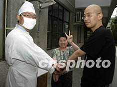 北京SARS醫療專家、人民醫院ICU主任安友仲教授,8月15日到北京地壇醫院祝賀將于16日出院的中國最后兩名SARS康復患者孫崢(右)、盧志艷(中)。安友仲教授曾在過去的三個月內分別參予這兩名患者的轉院搶救治療。中新社記者:任晨鳴