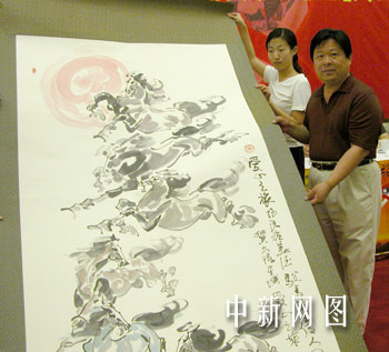 著名畫家李繁民向采訪團贈送《神駿圖》。余瑞冬 攝