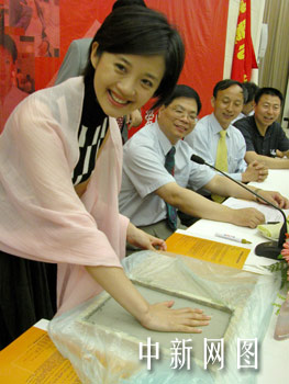 知名電視節目女主持人許戈輝在啟程儀式上按下象征愛心與弱者牽手的手印。余瑞冬 攝