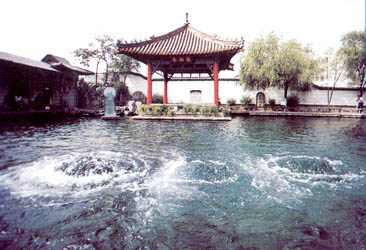 趵突泉北岸有一組較大的古建筑群,通稱三大殿。最南大殿“濼源堂”,三間兩層,歇山飛檐,古色古香,建于北宋年間,挹廈柱上,刻著元代文學(xué)家趙孟兆頁的著名詩句:“云霧潤蒸華不住,波濤聲震大明湖!弊煮w雄渾有力,詩句生動傳神,恰與眼前的波光水影交相輝映。殿堂后面還有兩座大殿,原寫“娥姜祠”,現(xiàn)寫“娥英祠”,后人為贊頌舜的兩位妃子娥皇、女英而建祠,以志紀(jì)念。在三大殿院內(nèi)的花格透墻上,鑲嵌著30余方石刻,都是歷代名人的佳作詩篇。特別值得一提的是院內(nèi)的那尊罕見的“雙御碑”,記載著康熙三臨、乾隆二臨趵突泉的題詞詩文,標(biāo)示著趵突泉的地位。