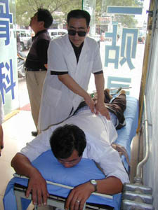 山東省德州市盲人馬利群在給病人治療腰椎間盤突出,老馬的夫人是一個身體健康的大專生,他倆有一個活潑可愛、身體健康的5歲孩子。華夏時報圖