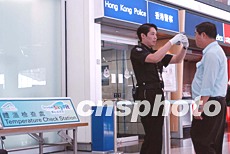 香港衛生署對新加坡出現SARS疑似病例發表聲明,將密切留意,保持高度戒備,圖為九日香港國際機場嚴格測量體溫措施到位不松懈。作者:潘索菲
