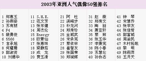 據聯合早報報道,“2003年亞洲人氣偶像50強”投選范圍包括從事演藝、歌唱、體育、模特兒及服裝界的亞洲人士。經過5周熱烈的投票,吸引將近7萬張選票。