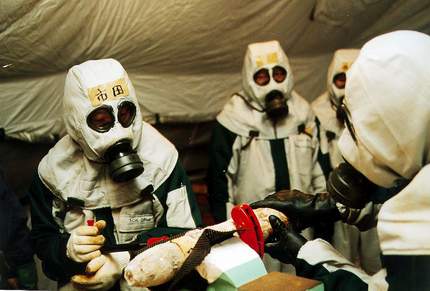 具體的處理程序是:金屬探測————先通過電磁探測,測出毒彈掩埋的準(zhǔn)確邊際,確定挖掘的方位;挖掘作業(yè)————使用銅針、銅鏟等器具,小心將已經(jīng)銹蝕、滲漏的毒氣彈挖掘出來;冷卻處理————將挖掘出的毒氣彈放置到零下40℃的冷藏柜,進(jìn)行12個(gè)小時(shí)的冷卻,使毒氣彈溫度降到零下30℃;X光鑒別————通過大功率X光鑒別,搞清楚毒彈內(nèi)部結(jié)構(gòu);彈、藥分離———將彈體切割;外形鑒別;密封包裝。