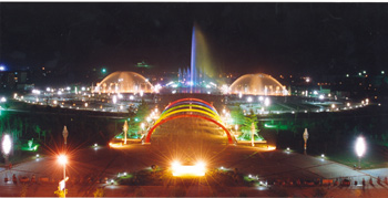 在主入口廣場上的五彩世紀門,宛若彩虹飛至,象征新世紀的曙光。市民廣場以硬質景觀為主,便于人們集會、休憩、交往,是真正意義上的城市客廳,在市民廣場上建有大型水旱組合型彩色音樂噴泉,共有28種水形變化。其東西長200米,面積4500余平米,并配有水幕投影系統,中央旱噴泉主噴高達80米。東西兩側水泉對稱布置,為觀賞噴泉。兩側旱泉為游戲噴泉,以滿足人們的親水愿望,東側有奧運五環、時空隧道、歡快跳泉,西側有戲水踏泉、游戲迷宮,兩側可同時供200多人參與游戲。音樂噴泉綜合運用現代高科技手段,聲、光、水、電的完美結合,使噴泉水形豐富、氣勢宏偉、搖曳多姿,隨著音樂翩翩起舞,夜晚在彩色燈光的照耀下,更顯得魂麗多彩,聲、光、水景把您帶入一個優美的藝術境界。它充分表現了保定一千一百萬人民團結奮進、蓬勃向上、經濟和社會發展日新月異、繁榮昌盛的壯麗景象。在市民廣場的下面建有地下商城,占地面積3萬平米,為游人購物、餐飲、娛樂、提供了寬敞、便利的空間。