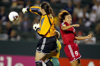 下半場中國隊進行了調整,并在開賽第一分鐘就利用一次邊路的傳中機會,由白潔在亂軍中將球射向對方大門。雖然澳大利亞隊后衛將球碰了一下,但并沒有將球擋出。中國隊扳平了比分。