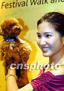 香港藝人原子鏸抱著心愛的小狗,出席在“又一城”舉行的“秋日浪漫展霓裳”時裝展。作者:洪少葵