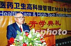 中山大學(xué)醫(yī)藥衛(wèi)生高科技管理EMBA學(xué)位項(xiàng)目的開(kāi)學(xué)典禮二十六日在廣州中山大學(xué)嶺南學(xué)院舉行,這是中國(guó)第一個(gè)獲準(zhǔn)頒發(fā)醫(yī)療服務(wù)方向管理教育(EMBA)學(xué)位的項(xiàng)目。圖為嶺南(大學(xué))學(xué)院董事會(huì)名譽(yù)主席伍沾德先生在典禮上致詞。作者:羅仰明
