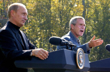 普京和布什兩人在華盛頓附近的戴維營(yíng)舉行了一次兩天的會(huì)談。他們也談到了有關(guān)車臣地區(qū)的持續(xù)不斷的沖突。兩人形容自己為“對(duì)抗恐怖活動(dòng)戰(zhàn)爭(zhēng)中的盟友”。