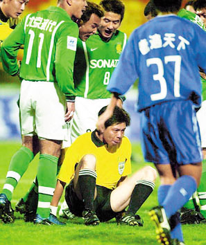 據(jù)新聞晨報報道,這個判罰激怒了北京隊員,外援雷吉納爾多沖向楊志強,一把推搡之下瘦弱的裁判被摔倒在地。這一暴力舉動迅速激化了場上局勢,北京隊數(shù)名隊員沖了過來,圍住楊志強,國安俱樂部工作人員也沖入場內(nèi)指責(zé)裁判。兩個邊裁也來到楊志強附近,擔(dān)當(dāng)起保衛(wèi)同盟者的職責(zé)。賽區(qū)監(jiān)督眼見形勢不妙,指揮數(shù)十名警察涌入場內(nèi)維持秩序。那個時候的鞍山賽場已亂成了一團(tuán)粥,比賽也因此延時5分鐘。