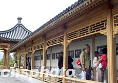 曾經毀于八國聯軍的頤和園耕織圖景區,經過修繕現已部分向游人開放。“十一”長假期間在臨水的廊廡中陳列著的數十塊耕織圖復制品引人注目。中新社記者:張勤