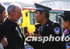 參加國(guó)慶值勤的北京警察學(xué)院學(xué)員,四日在天安門(mén)廣場(chǎng)為外國(guó)游人解答問(wèn)題。“十一”期間首都警方加大了旅游景區(qū)的值勤力量,以確保游客安全。中新社記者:宋吉河