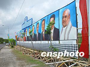 東盟系列峰會將于七日在印尼旅游勝地巴厘島揭幕,溫家寶等十四個與會國家領導人的巨幅頭像懸掛于道路兩旁。中新社記者 齊彬 攝
