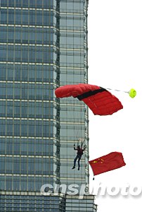 下午三時許,開幕禮炮聲后一位身著紅色跳傘服的運動員隨即應聲而下,他的縱身一躍亦解開了“中華高樓跳傘第一人”的謎團,此人便是挪威跳傘家特杰·海爾維森。他背對著藍天,在躍出平臺后不久就打開了紅色降落傘,并隨之展開了一面中國國旗。據悉,此次是海爾維森先生第三次中國之行,為了這一次機會他足足等待了四年。在準確降落在著陸點后,海爾維森先生顯得特別激動,他興奮地說:“帶著中國國旗翱翔藍天是我一生中最為難忘、最為激動的一刻!