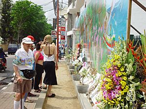 時隔一年,前來這里報道東盟系列峰會的本社記者踏訪爆炸案現場,追尋恐怖主義的罪惡,感受人們對和平的渴望。遠遠望去,在鱗次櫛比的商店旅館中間,有一片用木板和鐵柵欄圍起的空地,格外顯眼。當記者的采訪車剛剛停下,一位身材壯實的警察即走上前來,用不太流利的英語向記者介紹爆炸發生時的慘狀。