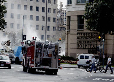 發生大火的街道位于喬治·華盛頓大學醫院的新樓和舊樓之間,距離白宮不到一公里。大火發生后,這家醫院的工作人員疏散了非急需的工作人員和來訪者,并把重點護理病人轉移到離大火最遠一側的病房。