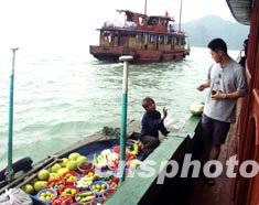 下龍灣離越南首都河內165公里,有成千座石島,島上有許多山洞,可以互相貫穿,并呈現不同的形狀,是世界奇觀之一,盡管氣候炎熱,仍有游客接踵而至。圖為在下龍灣游覽的中國游客向船家購買新鮮水果。作者:陶社蘭
