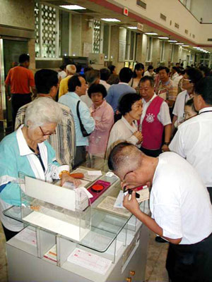 臺銀金融卡被盜領臺灣民眾到銀行整理存折。(臺灣“中國時報”圖)