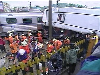 中新網(wǎng)10月14日電 臺北縣鶯歌鎮(zhèn)今日上午7點38分,發(fā)生重大車禍,在東鶯路平交道,游覽車疑似闖平交道,當場被南下電聯(lián)車撞上,造成4死27人受傷。