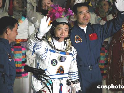中國酒泉衛星發射中心為執行首次載人航天飛行任務的航天員楊利偉舉行出征儀式,圖為楊利偉向前來送行的人們揮手致意。中新社記者 孫自法 攝