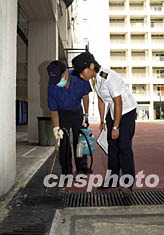 香港當局為加強預防登革熱的工作,教育統籌局及食環署現正進行為期一星期的巡視學校行動。圖為食環署人員十六日在梁式芝書院操場的水渠噴灑蚊油。中新社圖
