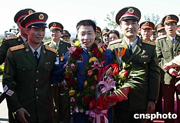 十月十六日上午,中國首位航天員楊利偉回到北京航天城,與另兩位航天員梯隊成員會合。作者:張桐勝