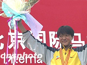 前不久在法國巴黎世界田徑錦標賽上取得一枚銅牌的孫英杰是二00三年三星北京國際馬拉松賽女子組唯一的奪冠“大熱門”。在比賽過程中,孫英杰始終處于領跑的第一集團之中,并于后半程脫穎而出,最終以二小時十九分三十九秒的成績輕松奪得女子組冠軍,創造北京國際馬拉松賽女子組歷史最好成績。