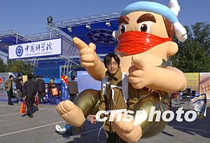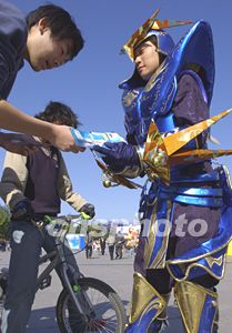 來自韓國、日本等地的互聯網游戲提供商與中國網絡游戲企業擺開陣勢,“一決高下”。圖為網絡游戲人物向參觀者派發產品資料。中新社記者:張煒