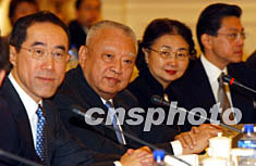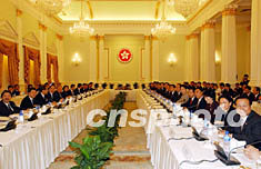 十月二十七日,滬港經貿合作會議在香港禮賓府舉行,圖為香港特別行政區行政長官董建華、財政司司長唐英年、律政司司長梁愛詩出席該會議。中新社記者:潘索菲