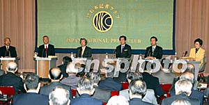 日本眾議院選舉將于28日正式開鑼,日本政界六個政黨的首領(左起依次為保守新黨代表熊谷弘、公明黨代表神崎武法、自民黨總裁小泉純一郎、民主黨代表菅直人、共產黨委員長志位和夫、社民黨黨首土井多賀子)27日在日本記者俱樂部共聚一臺唇槍舌劍。作者:王健