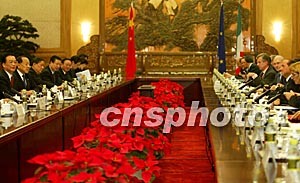 中歐領導人第六次會談三十日在北京舉行。中國國務院總理溫家寶、歐洲理事會主席意大利總理貝盧斯科尼、歐盟委員會主席普羅迪等出席會談。鄭萍萍 攝