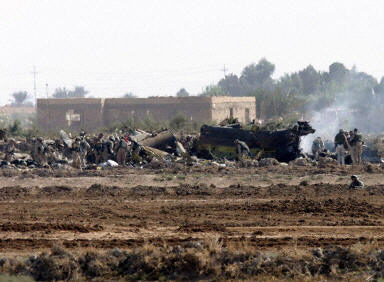 駐伊美軍發言人說,目前已證實2日在巴格達附近被擊落的美軍運輸直升機造成13人死亡,至少20人受傷。圖為墜落在費盧杰的美軍用直升機失事現場。
