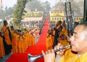 昨天在大明寺棲靈塔下舉行了盛大的紀(jì)念大會。來自國家、江蘇省有關(guān)方面的官員,鑒真東渡經(jīng)過及學(xué)習(xí)過的寺廟之諸山長老法師及港澳臺和日本的客人數(shù)千人參加了大會。紀(jì)念大會由揚州市委副書記、常務(wù)副市長洪錦華主持,中央統(tǒng)戰(zhàn)部副部長朱維群、國家宗教事務(wù)局局長葉小文、中日友好協(xié)會副會長文遲、中國佛教協(xié)會副會長學(xué)誠法師、江蘇省副省長何權(quán)、省委統(tǒng)戰(zhàn)部副部長、省宗教事務(wù)局局長翁振進(jìn)、省臺辦副主任潘朗哉、省對外友協(xié)副會長、省佛教協(xié)會會長明學(xué)法師、日本駐滬總領(lǐng)事杉本信行、日本奈良唐招提寺益田快范長老、臺灣佛光山開山宗長星云、香港大學(xué)副校長、中國工程院院士李焯芬,揚州市府官員孫志軍、季建業(yè)、徐益民等參加了大會。