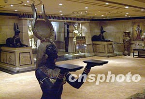 澳門博彩股份有限公司八日起首次舉辦娛樂場貴賓廳開放日,位于置地廣場的五個超豪華貴賓廳占地兩萬六千平方尺,以埃及文化為主題,一梁一柱均重現古埃及王朝的繁華景像。中新社記者:李剛