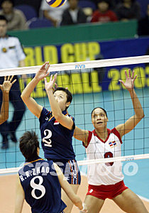 2003年11月9日,第九屆女排世界杯賽在日本舉行。多米尼加隊9號隊員阿里亞斯被查出服用興奮劑。圖為11月3日阿里亞斯(右)在同中國隊的比賽時準備攔網。中體在線/供圖